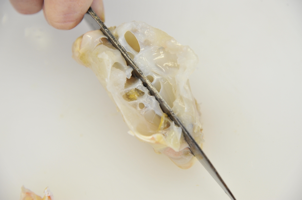 5. 切り落とした足の表を削いで身が見えるようにする。